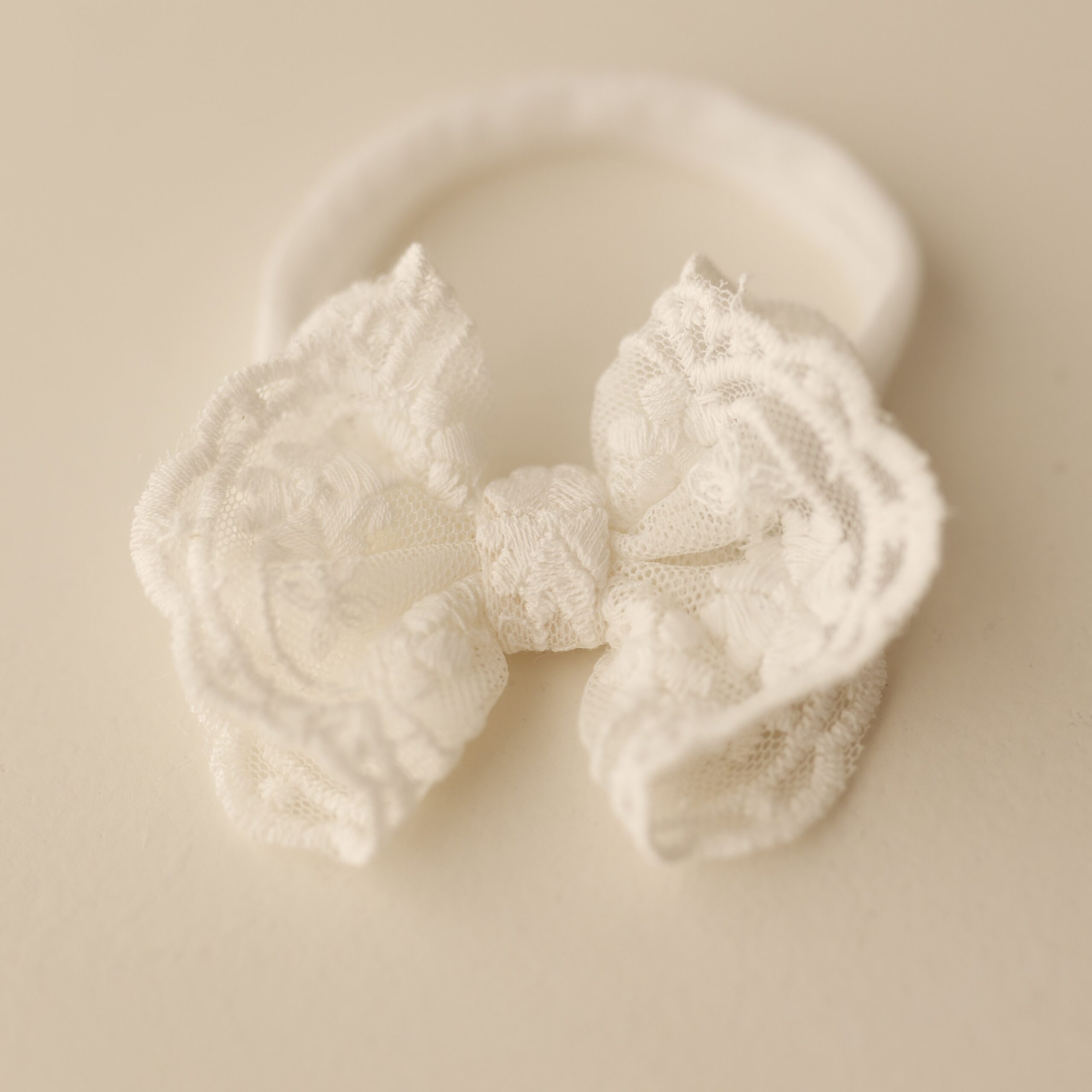 Os laçinhos são feitos com renda e a faixinha é de meia de seda de exelente qualidade quando você estica ela já volta para o lugar normalmente, ela também não aperta a cabecinha do bebê, produção 100% artesanal.