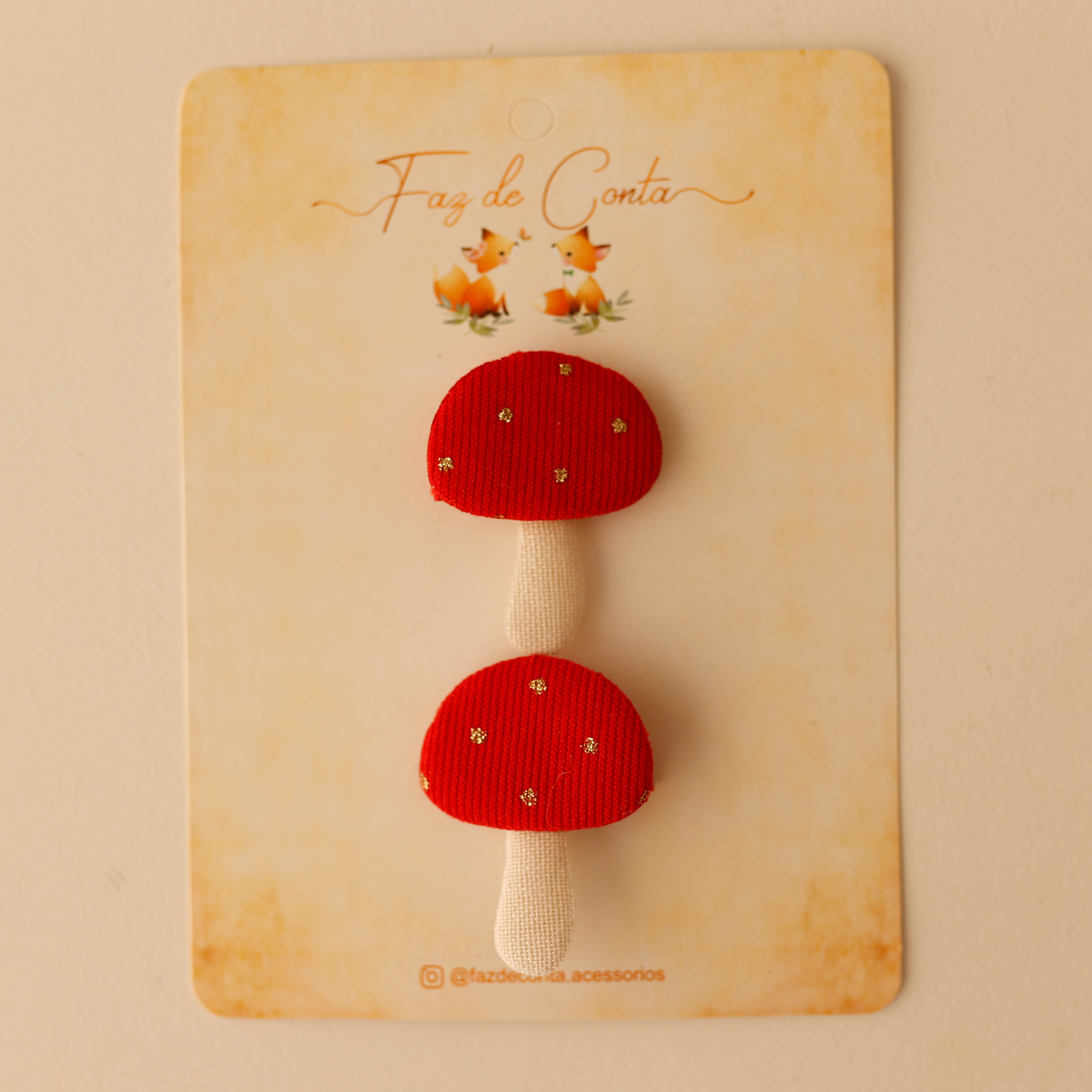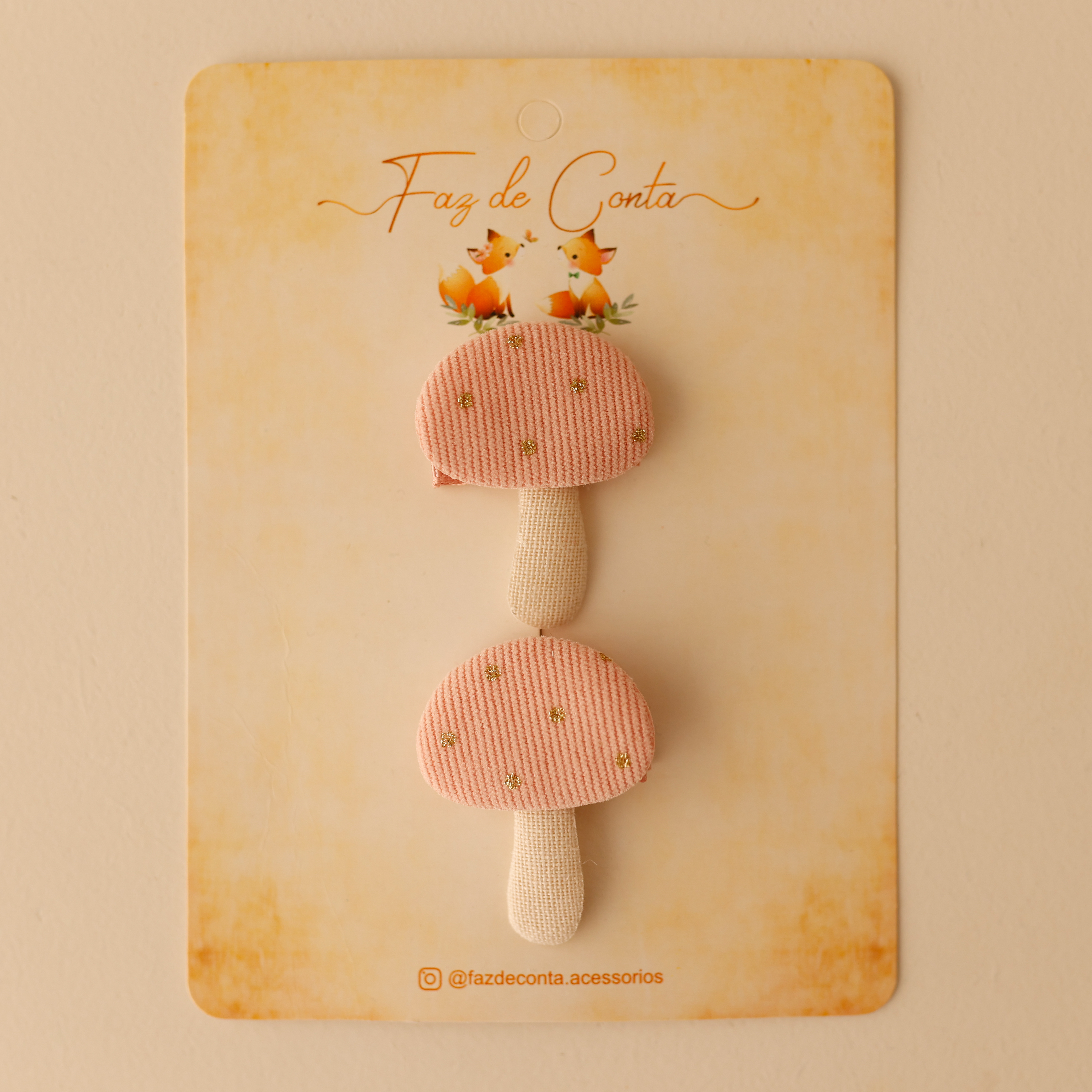 O destaque fica por conta do aplique de cogumelo, cuidadosamente colado sobre a presilha, trazendo um toque suave e elegante.