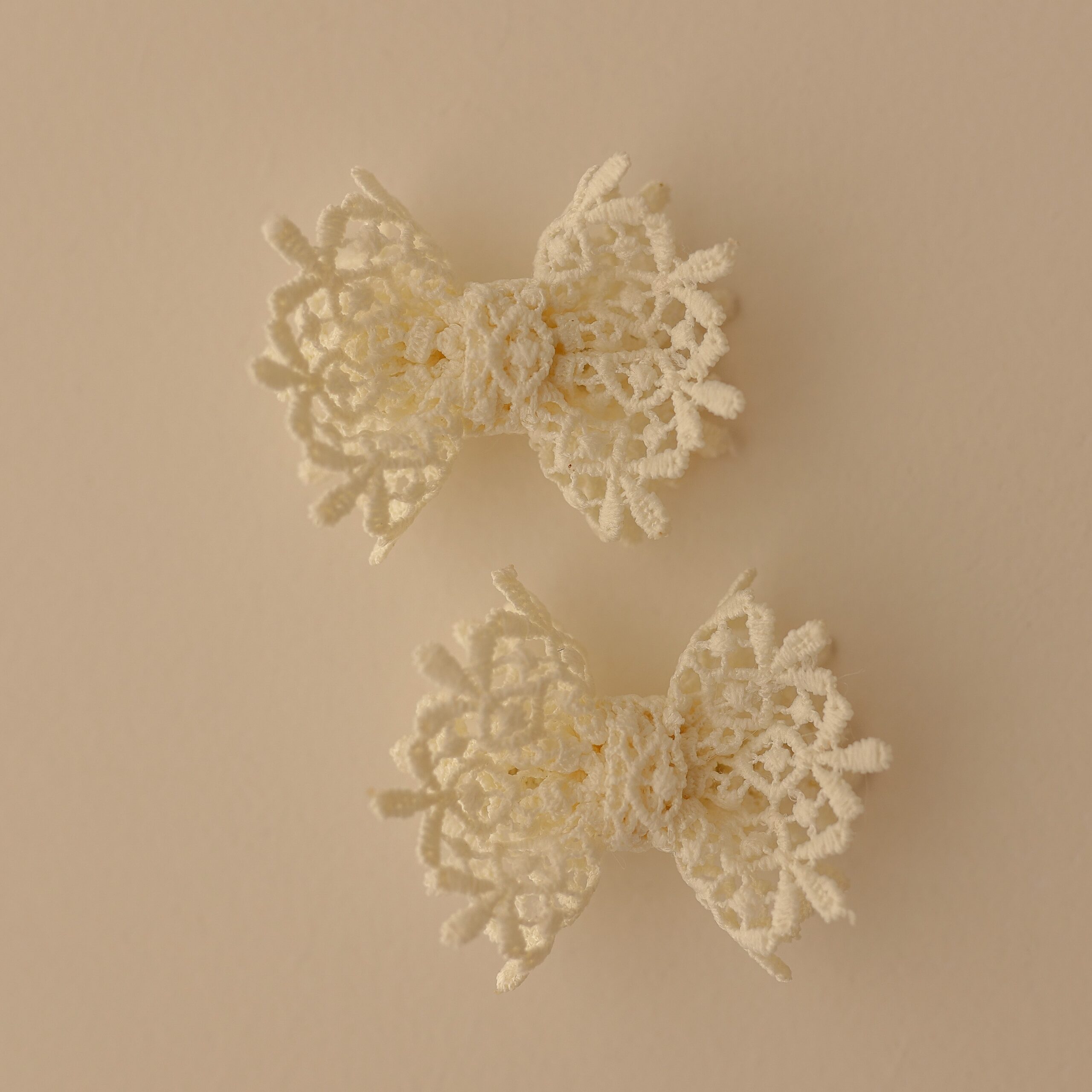 Os laços são confeccionados artesanalmente com renda floral ornamental — cortados, costurados e colados à mão com muito cuidado.
