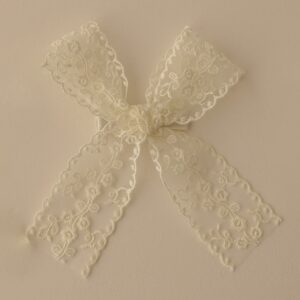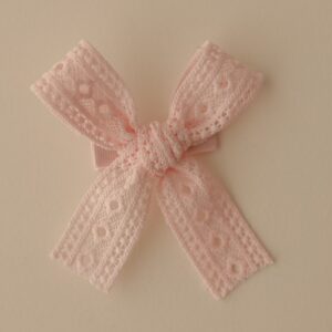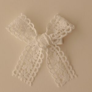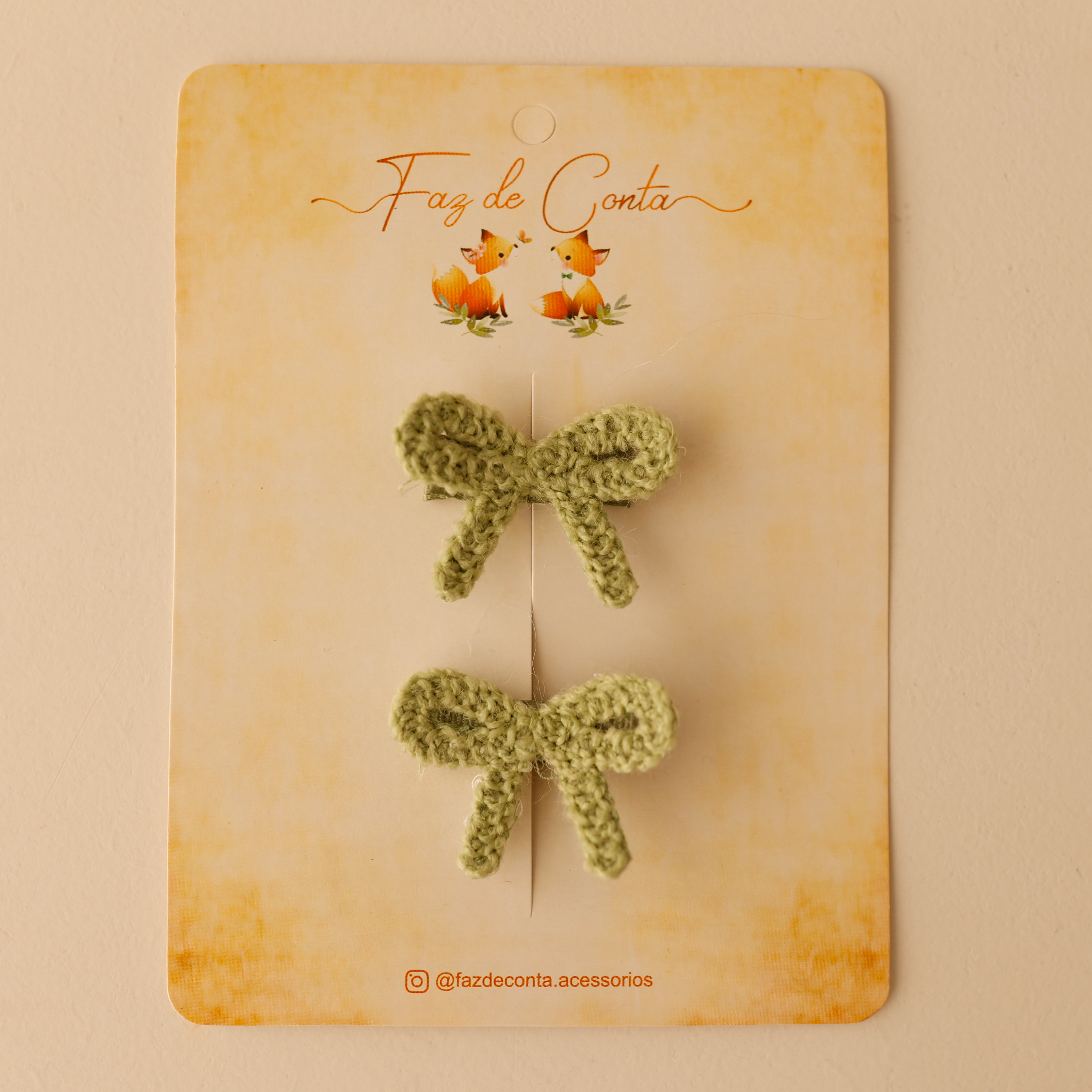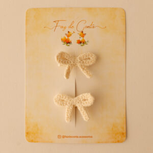 O destaque fica por conta do laço de tricô, cuidadosamente colado sobre a presilha, trazendo um toque suave e elegante.