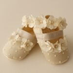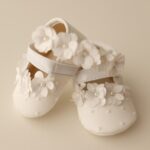 Temos sapatilha de Cetim no Branco e no Off com flor de Cetim, acompanha uma faixa de meia de seda com flor de Cetim.